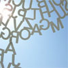Description: a random display of letters on a statue that is taken against a sunny sky